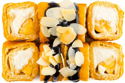 Тортилья, Банан, Сливочный сыр, Сгущеное молоко, Шоколадный топпинг, Миндальные лепестки, Кляр, Сухари,