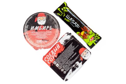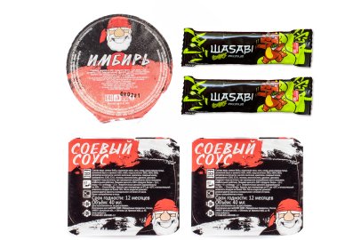 Васаби 1шт, имбирь 1шт, соевый соус 2шт, Мака Чикен, Запеченный Норико, Запеченный Киото, Омлетто ролл, Запеченная Пеппа,