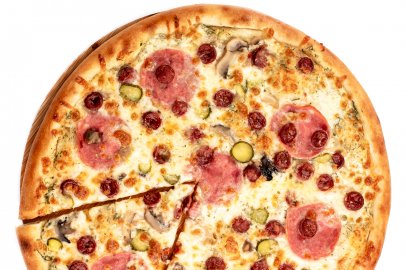 Ветчина, Помидор, Фарш говяжий, Тесто на итальянской муке, Томатный соус, Шампиньоны, Пепперони, Моцарелла,