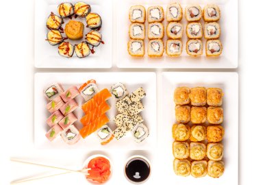 Васаби 1шт, имбирь 1шт, соевый соус 2шт, Филадельфия лайт, Дайкон ролл 1/2, Калифорния с крабом 1/2, Классика с огурцом, Классика с курицей и соусом (сверху),